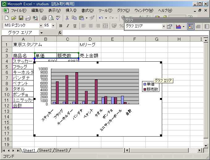 グラフの場合には必ず全体にハンドルが付くように、グラフの背景の部分をクリックして選択