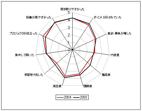 全体 N 平均値 標準偏差 最小値 最大値 -------------------------------------------------------------- Q1 聞き取りやすかった 72 4.292 0.830 1.000 5.000 Q2 ポイントが示されていた 72 3.778 0.736 1.000 5.000 Q3 意欲・興味が増した 72 3.417 0.801 1.000 5.000 Q4 内容量 72 3.014 0.639 1.000 5.000 Q5 難易度 72 2.708 0.701 1.000 5.000 Q6 理解度 72 3.319 0.901 1.000 5.000 Q7 満足度 72 3.639 0.844 1.000 5.000 Q8 学習努力をした 72 2.833 1.061 1.000 5.000 Q9 集中して聞いた 72 3.431 1.072 1.000 5.000 Q10 プロジェクタが役立った 72 4.222 0.892 1.000 5.000 Q11 板書が見やすかった 72 4.153 0.883 1.000 5.000 --------------------------------------------------------------