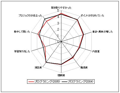 プログラミング N 平均値 標準偏差 最小値 最大値 ------------------------------------------------------------------- Q1 聞き取りやすかった 54 4.537 0.605 3.000 5.000 Q2 ポイントが示されていた 54 4.278 0.811 1.000 5.000 Q3 意欲・興味が増した 54 3.648 0.935 1.000 5.000 Q4 内容量 54 2.926 0.470 1.000 4.000 Q5 難易度 54 3.204 0.711 1.000 5.000 Q6 理解度 54 3.667 0.801 2.000 5.000 Q7 満足度 54 4.111 0.744 2.000 5.000 Q8 学習努力をした 54 2.741 1.085 1.000 5.000 Q9 集中して聞いた 54 3.944 0.763 2.000 5.000 Q10 プロジェクタが役立った 54 4.000 0.801 2.000 5.000 -------------------------------------------------------------------