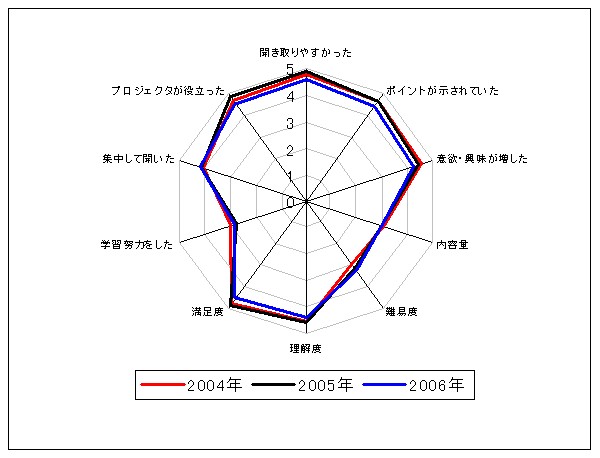 Q1. 話し方は明瞭で聞き取りやすかった Q2. 授業の中で重要なポイントをはっきり示してくれた Q3. 授業では、学習意欲や興味が増すように工夫されていた Q4. 授業の内容量はどうであったか Q5. 授業の難易度はどうであったか Q6. 授業内容は理解できたか Q7. 授業は総合的に見て満足のいくものであった Q8. 予習・復習・宿題など積極的に学習努力をした Q9. 授業中は、集中して教員の話を聞いた Q10. プロジェクタを利用した解説は理解を深めるために役立った(調査票PDFファイル)
