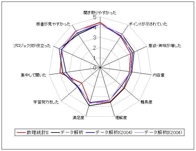 全体 N 平均値 標準偏差 最小値 最大値 ------------------------------------------------------------------- Q1 聞き取りやすかった 62 4.355 0.515 3.000 5.000 Q2 ポイントが示されていた 62 3.790 0.832 1.000 5.000 Q3 意欲・興味が増した 62 3.452 0.918 1.000 5.000 Q4 内容量 62 3.016 0.424 2.000 4.000 Q5 難易度 62 3.081 0.660 1.000 5.000 Q6 理解度 61 3.525 0.744 2.000 5.000 Q7 満足度 62 3.806 0.649 2.000 5.000 Q8 学習努力をした 62 2.677 0.864 1.000 4.000 Q9 集中して聞いた 62 3.774 0.798 2.000 5.000 Q10 プロジェクタが役立った 62 4.274 0.793 2.000 5.000 Q11 板書が見やすかった 62 4.032 0.809 2.000 5.000 ------------------------------------------------------------------- 数理統計II N 平均値 標準偏差 最小値 最大値 ------------------------------------------------------------------- Q1 聞き取りやすかった 25 4.440 0.507 4.000 5.000 Q2 ポイントが示されていた 25 3.640 1.114 1.000 5.000 Q3 意欲・興味が増した 25 3.240 1.128 1.000 5.000 Q4 内容量 25 2.880 0.332 2.000 3.000 Q5 難易度 25 3.040 0.735 1.000 4.000 Q6 理解度 24 3.500 0.933 2.000 5.000 Q7 満足度 25 3.680 0.627 2.000 5.000 Q8 学習努力をした 25 2.360 0.952 1.000 4.000 Q9 集中して聞いた 25 3.920 0.702 3.000 5.000 Q10 プロジェクタが役立った 25 4.120 0.881 2.000 5.000 Q11 板書が見やすかった 25 4.280 0.792 2.000 5.000 ------------------------------------------------------------------- データ解析 N 平均値 標準偏差 最小値 最大値 ------------------------------------------------------------------- Q1 聞き取りやすかった 37 4.297 0.520 3.000 5.000 Q2 ポイントが示されていた 37 3.892 0.567 3.000 5.000 Q3 意欲・興味が増した 37 3.595 0.725 2.000 5.000 Q4 内容量 37 3.108 0.458 2.000 4.000 Q5 難易度 37 3.108 0.614 1.000 5.000 Q6 理解度 37 3.541 0.605 2.000 4.000 Q7 満足度 37 3.892 0.658 3.000 5.000 Q8 学習努力をした 37 2.892 0.737 2.000 4.000 Q9 集中して聞いた 37 3.676 0.852 2.000 5.000 Q10 プロジェクタが役立った 37 4.378 0.721 2.000 5.000 Q11 板書が見やすかった 37 3.865 0.787 2.000 5.000 -------------------------------------------------------------------