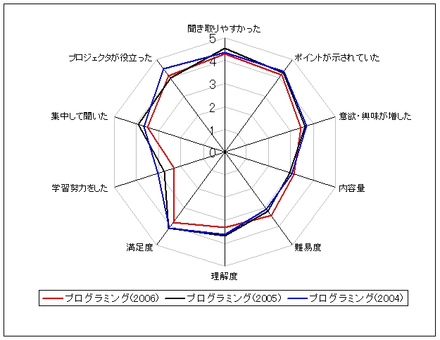 プログラミング N 平均値 標準偏差 最小値 最大値 ------------------------------------------------------------------- Q1 聞き取りやすかった 66 4.288 0.674 2.000 5.000 Q2 ポイントが示されていた 66 4.167 0.692 2.000 5.000 Q3 意欲・興味が増した 66 3.455 0.898 1.000 5.000 Q4 内容量 66 3.136 0.579 2.000 5.000 Q5 難易度 66 3.424 0.842 1.000 5.000 Q6 理解度 66 3.288 0.989 1.000 5.000 Q7 満足度 66 3.788 0.832 1.000 5.000 Q8 学習努力をした 66 2.318 1.040 1.000 5.000 Q9 集中して聞いた 66 3.530 0.808 1.000 5.000 Q10 プロジェクタが役立った 66 4.152 0.789 2.000 5.000 -------------------------------------------------------------------