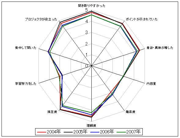 Q1. 話し方は明瞭で聞き取りやすかった Q2. 授業の中で重要なポイントをはっきり示してくれた Q3. 授業では、学習意欲や興味が増すように工夫されていた Q4. 授業の内容量はどうであったか Q5. 授業の難易度はどうであったか Q6. 授業内容は理解できたか Q7. 授業は総合的に見て満足のいくものであった Q8. 予習・復習・宿題など積極的に学習努力をした Q9. 授業中は、集中して教員の話を聞いた Q10. プロジェクタを利用した解説は理解を深めるために役立った(調査票PDFファイル)