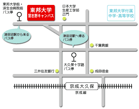 津田沼駅北口、京成バス4番、5番乗り場から約10分「東邦大学前・済生会病院前」下車
